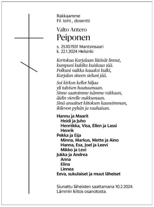 Mantsinsaaren Peltoisten kylässä 25.10.1931 syntynyt Valto Antero Peiponen lähti tuonilmaisiin aamuyöllä 22. tammikuuta 2024 Helsingissä. Mantsinsaaren miehen pitkä ja antoisa elämä päättyi kohta Leila-vaimon marraskuussa 2023 tapahtuneen lähdön jälkeen.