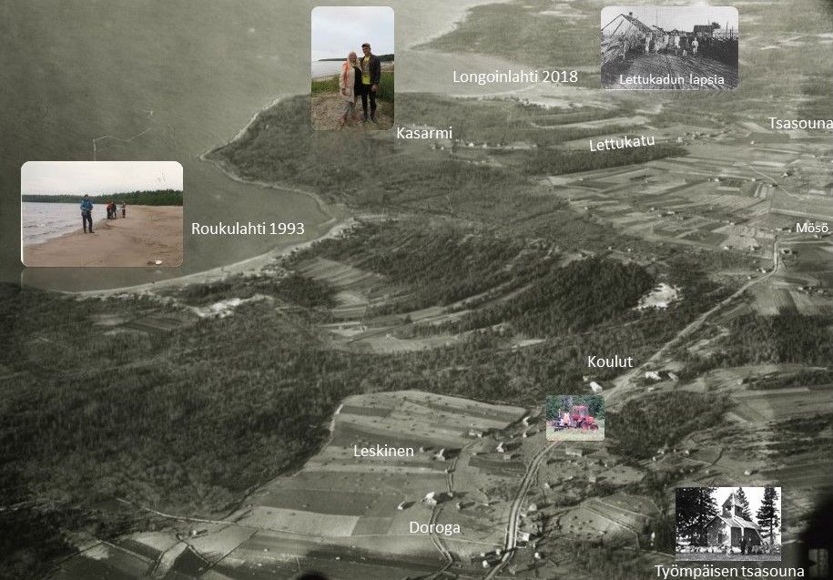 Tyytyväisinä nousimme takaisin ”karjaportille” ja kaarsimme Lettukatua kasarmialueen pellon reunaan. Täällä Martti osoitti tykkien paikan. Sieltä pellon vastakkaisella puolella seisoivat ja ampuivat tarkasti sotiemme sankarit, ”2 tykkiä”. Kun palasimme Oritselän tsasounalle, kaukana näkyi Martin kodin pihapuu. Konoilassa Martti syntyi keväällä 1944 ja joutui lähtemään evakkoon pahvilaatikossa samana kesänä. Täällä olemme jälleen.