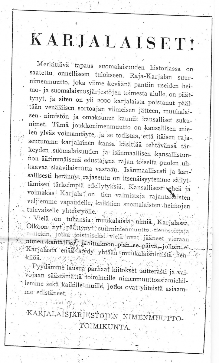 ”Me allekirjoittaneet ilmoitamme täten, että Viipurin läänin Maaherra on huhtikuu 14 p:nä 1931 hyväksynyt meille allaolevan luettelon mukiaset uudet sukunimet. Huhtikuun 22 p:nä 1931”