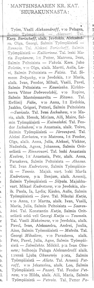Tässä on ”Karjalan Ääni” -lehdessä huhtikuussa 1931 julkaistut Mantsinsaarelaisten uudet nimet yläviitteellä: